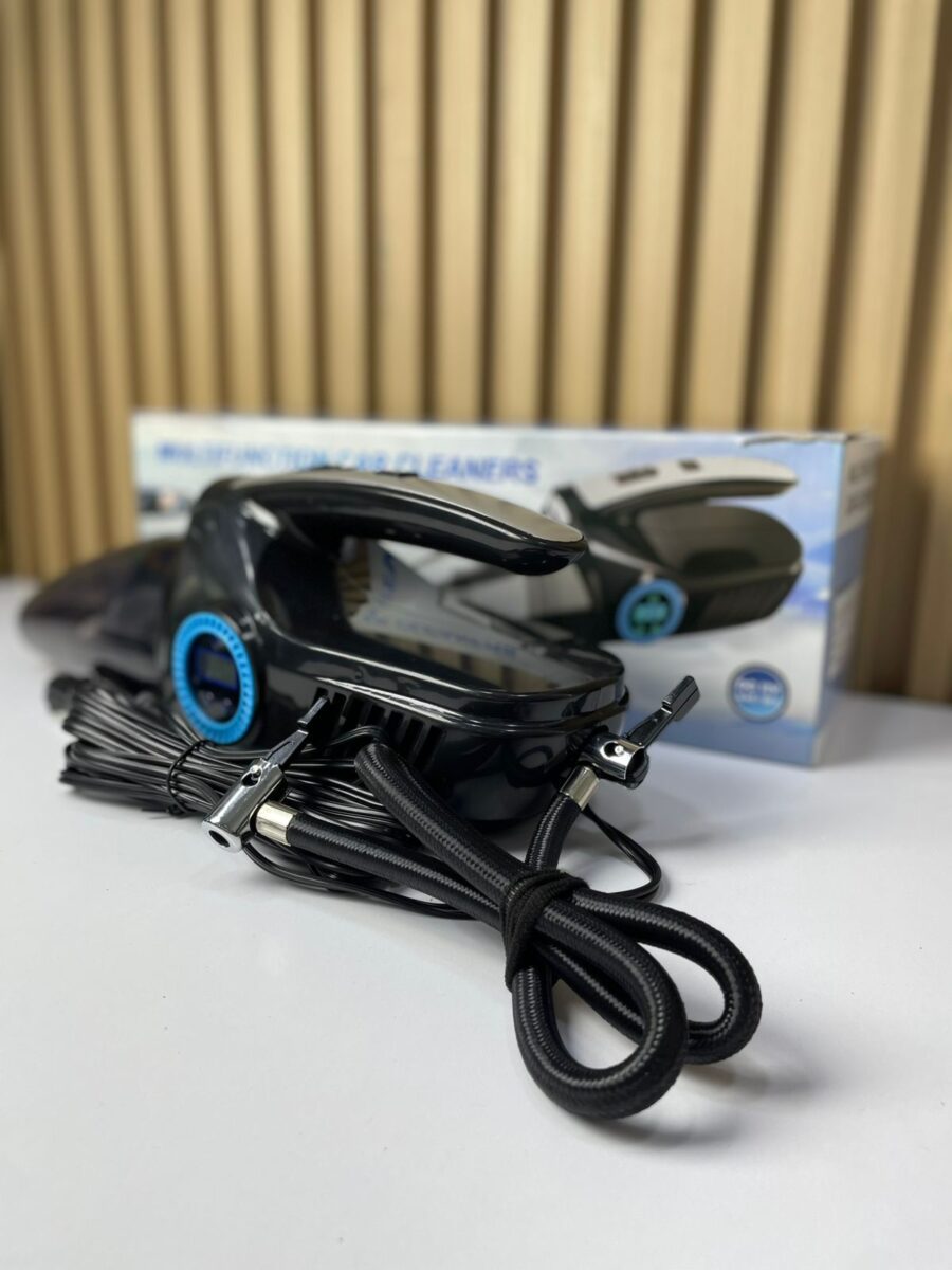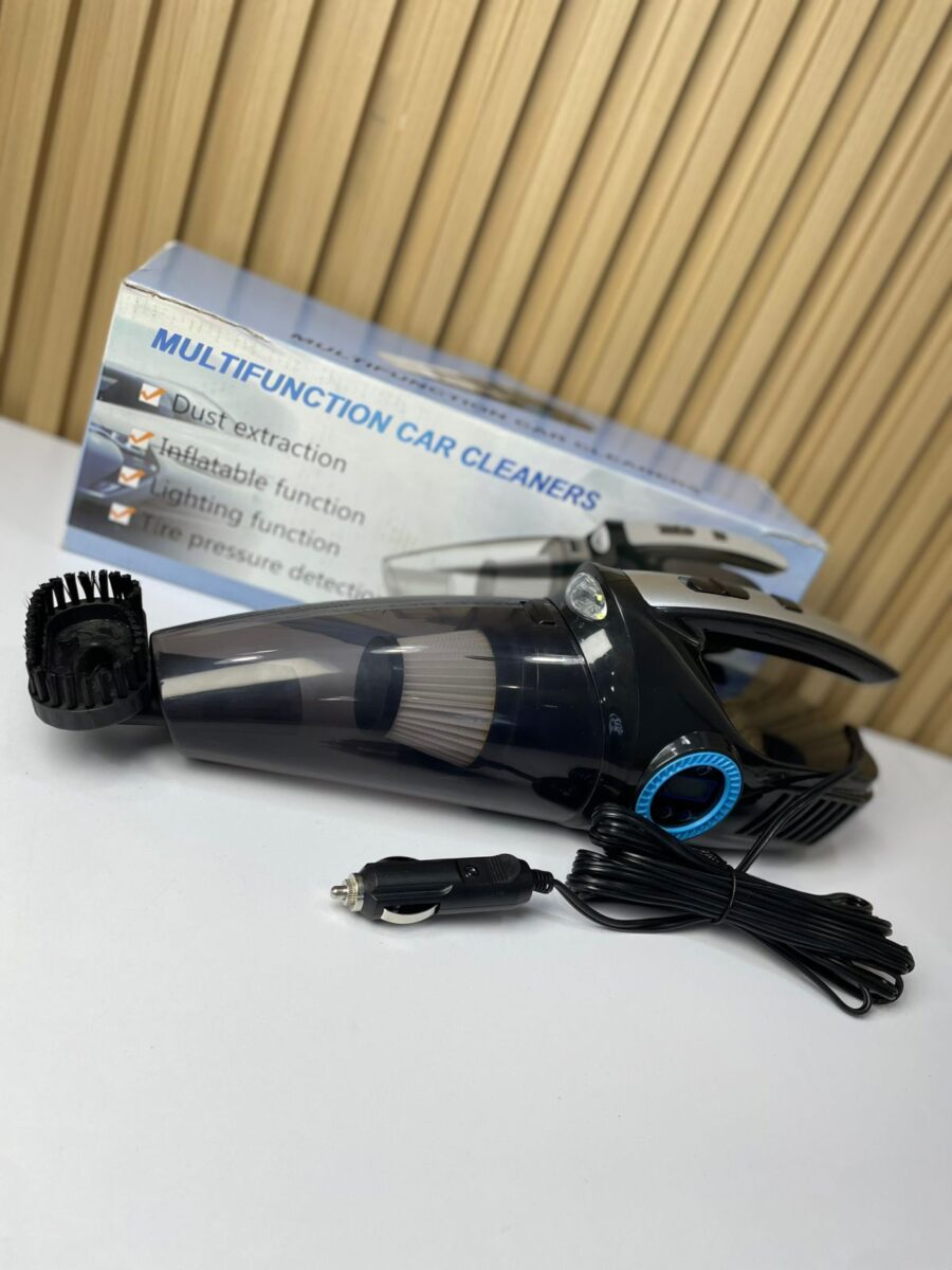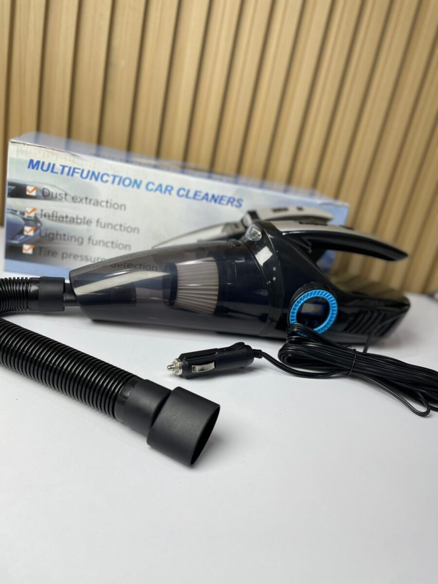 Equipo portátil multifunción que integra un sistema de aspiración de aire y compresión para inflado, diseñado para aplicaciones automotrices y domésticas. Combina en un solo dispositivo la capacidad de limpieza mediante succión y la generación de presión de aire para inflado de neumáticos u objetos inflables. Opera mediante alimentación eléctrica DC, con conexión directa a vehículo o batería externa, y cuenta con accesorios intercambiables para diferentes usos.