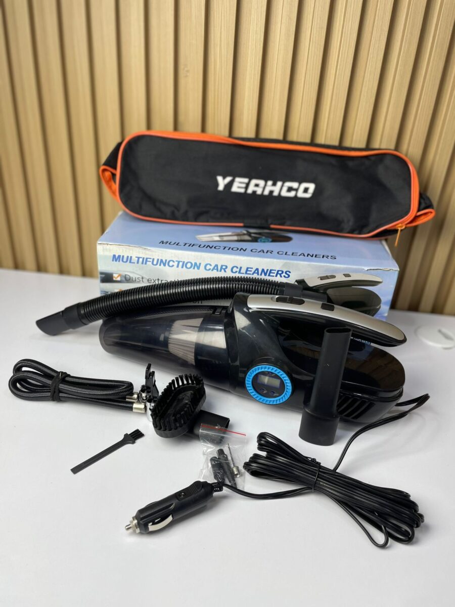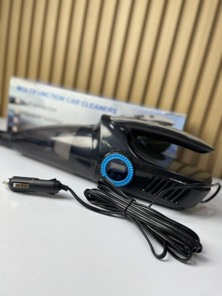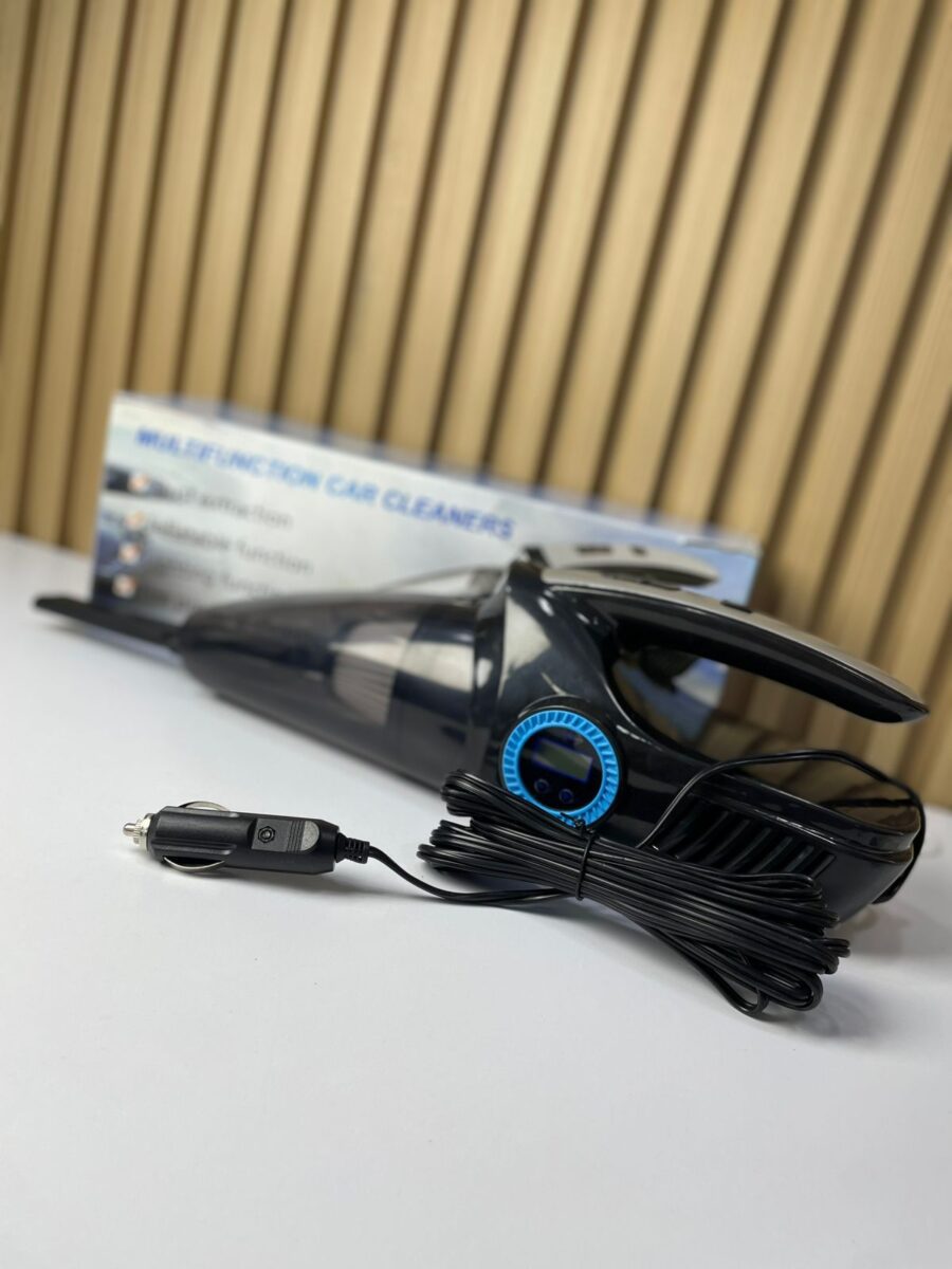 Equipo portátil multifunción que integra un sistema de aspiración de aire y compresión para inflado, diseñado para aplicaciones automotrices y domésticas. Combina en un solo dispositivo la capacidad de limpieza mediante succión y la generación de presión de aire para inflado de neumáticos u objetos inflables. Opera mediante alimentación eléctrica DC, con conexión directa a vehículo o batería externa, y cuenta con accesorios intercambiables para diferentes usos.
