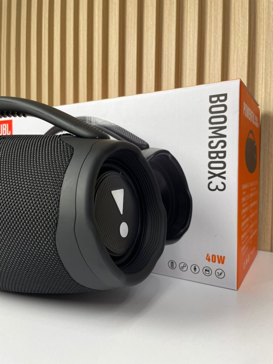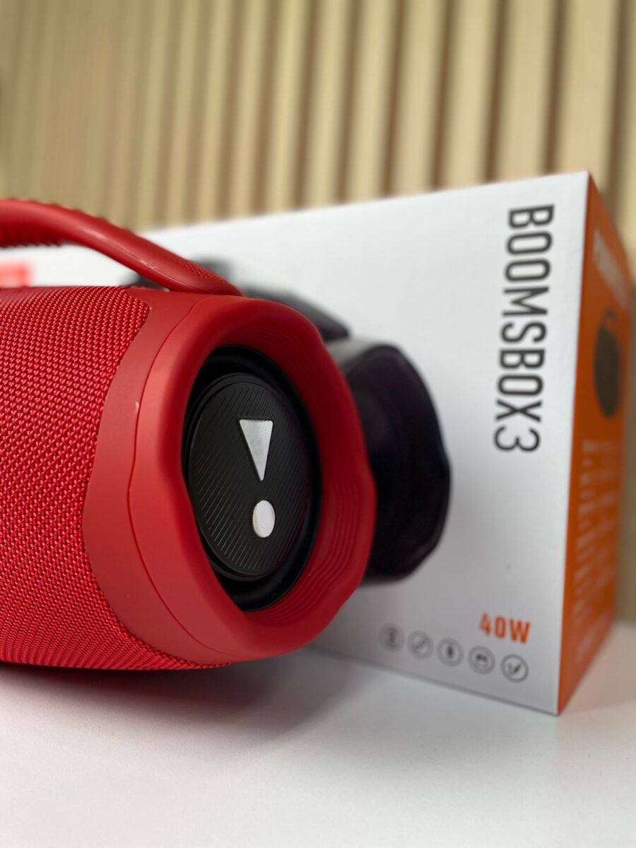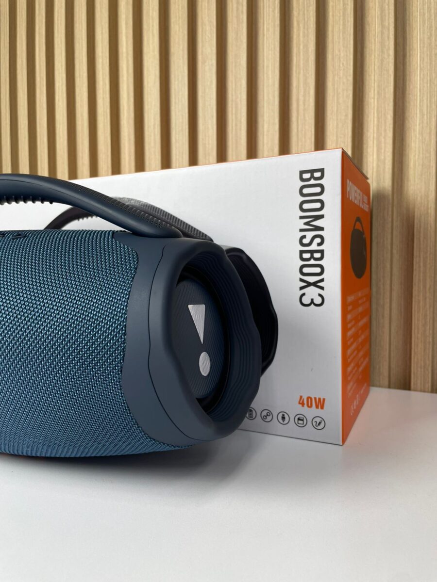El Booms Box 3 XL es un altavoz inalámbrico portátil de alta potencia (40 W) diseñado para ofrecer reproducción de audio con graves intensos y agudos claros en espacios abiertos o interiores. Su diseño robusto incluye un cuerpo cilíndrico cubierto por malla protectora, un asa ergonómica para transporte y radiadores pasivos laterales con iluminación LED. Es resistente a salpicaduras de agua, lo que lo hace apto para actividades al aire libre