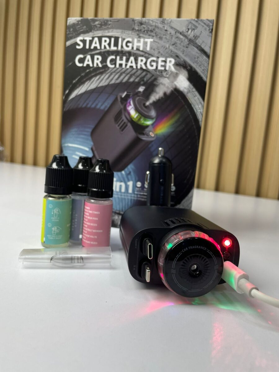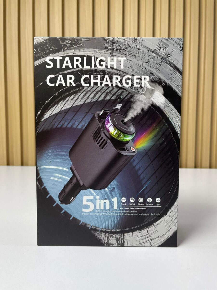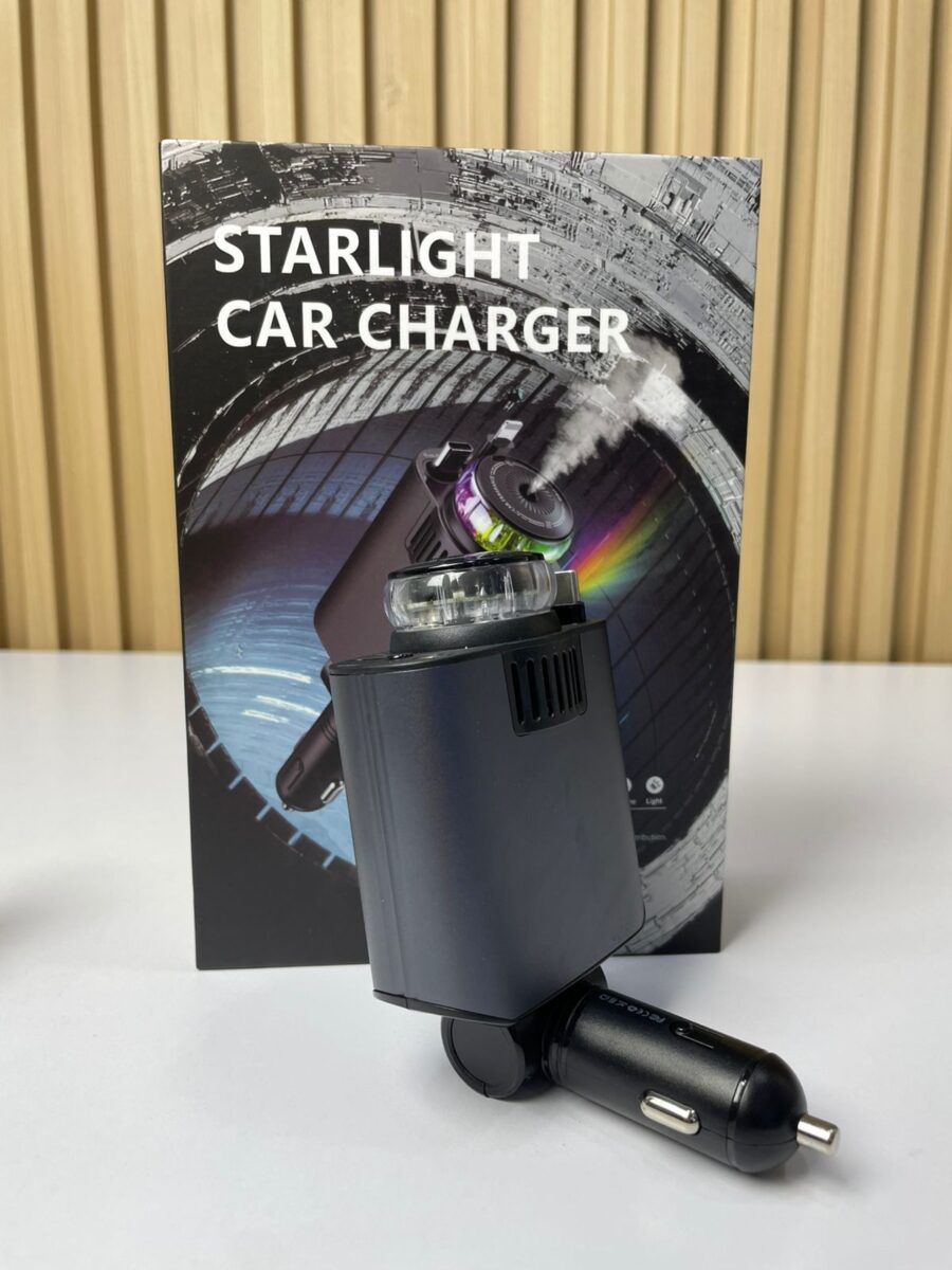 El cargador de carro 5 en 1 con humidificador y luz ambiental tipo starlight es un dispositivo multifuncional para vehículos que combina carga rápida multi-protocolo, humidificación por vapor frío, proyección de luz ambiental y aromaterapia opcional. Está diseñado para optimizar la experiencia dentro del automóvil, proporcionando no solo energía a los dispositivos electrónicos, sino también un ambiente más cómodo y personalizado durante la conducción.