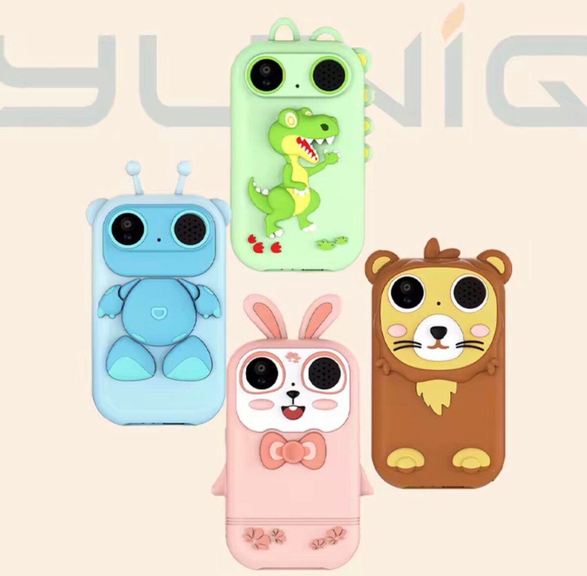 Dispositivo electrónico tipo celular infantil diseñado para uso recreativo y educativo por niños. El equipo presenta un formato compacto con pantalla a color y carcasa protectora de silicona con diseño infantil, orientado a introducir funciones básicas de fotografía, video, juegos y aprendizaje. No está concebido como teléfono móvil convencional, sino como dispositivo multimedia seguro para niños.