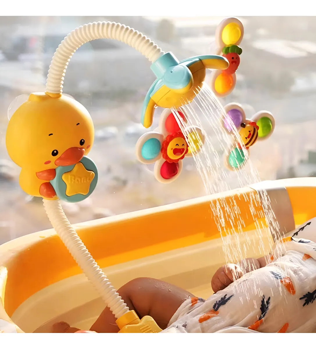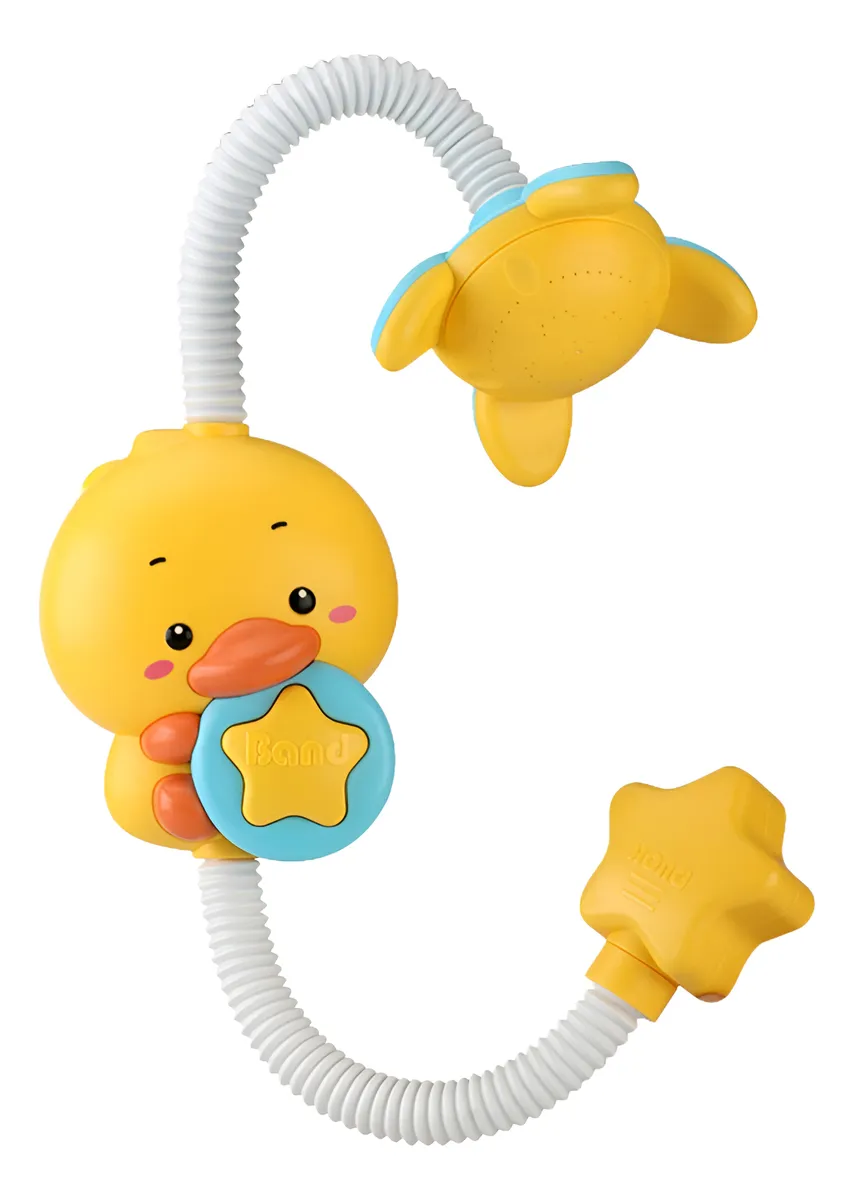 Regadera eléctrica infantil con diseño de pato, equipada con bomba sumergible y manguera flexible para proporcionar un flujo constante de agua templada durante el baño del bebé.