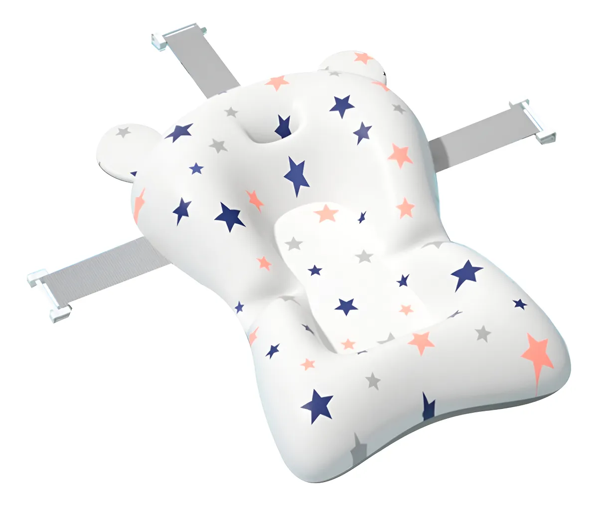 Cojín ergonómico de espuma y microfibra impermeable diseñado para sostener al bebé durante el baño, evitando deslizamientos y proporcionando soporte cervical y corporal.