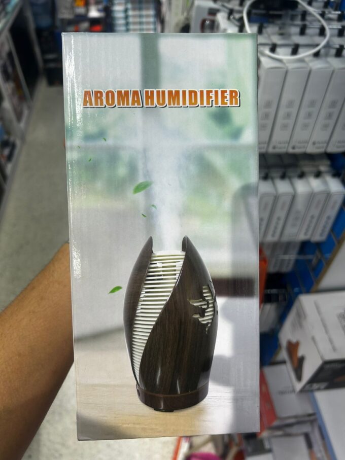 Un difusor ultrasónico de vapor frío con diseño decorativo inspirado en pétalos entrelazados. Su acabado tipo madera oscura, junto con su luz ambiental y tecnología silenciosa, lo hacen ideal para aromaterapia, humidificación de espacios y decoración moderna