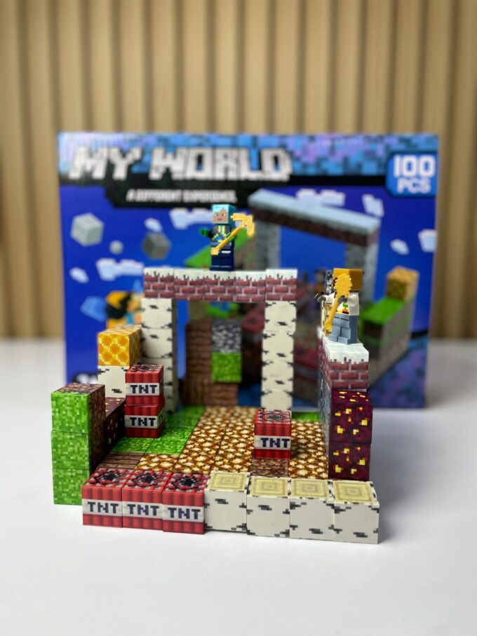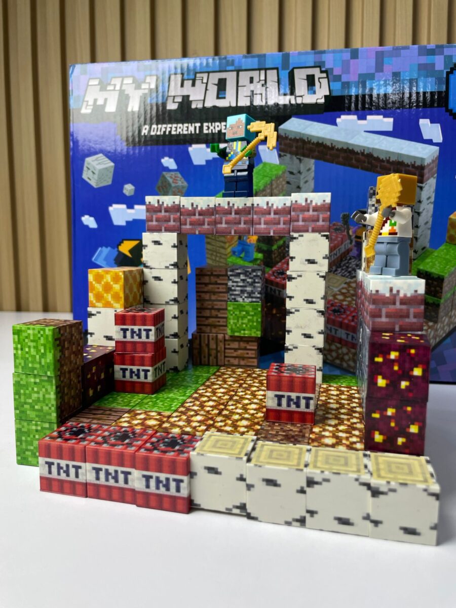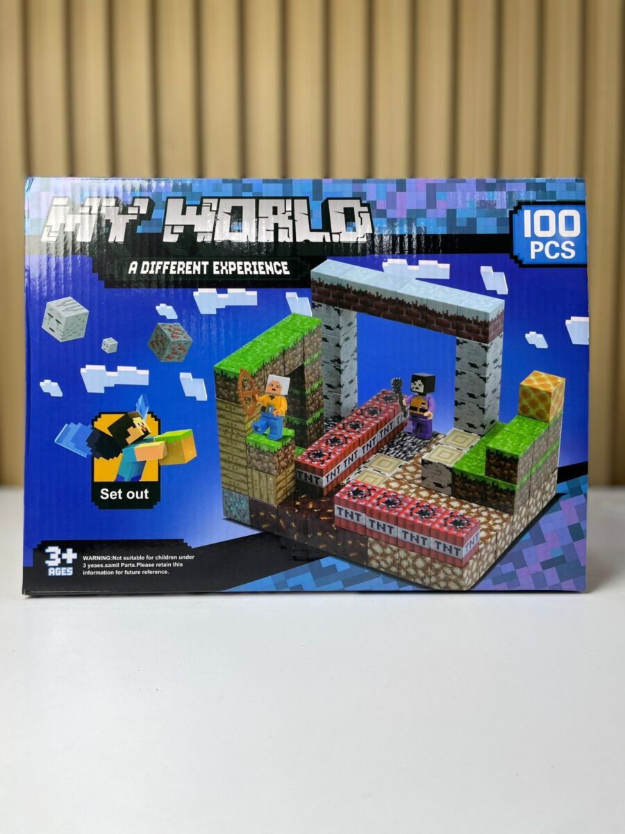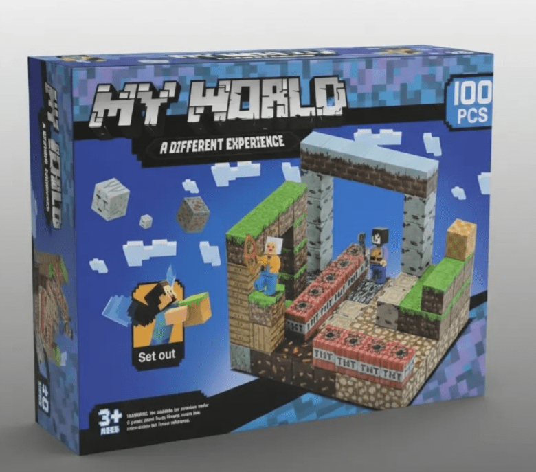 Juego de construcción modular tipo bloques ensamblables compuesto por 100 piezas, inspirado en entornos cúbicos digitales. El set permite la creación de estructuras tridimensionales mediante bloques temáticos con acabados gráficos impresos. Incluye piezas estructurales, bloques especiales y figuras tipo personaje, diseñados para ensamblaje manual mediante sistema de encaje a presión, orientado a actividades recreativas y desarrollo creativo.