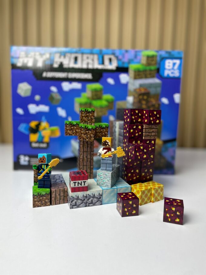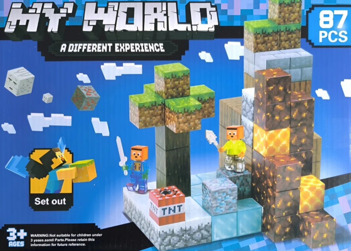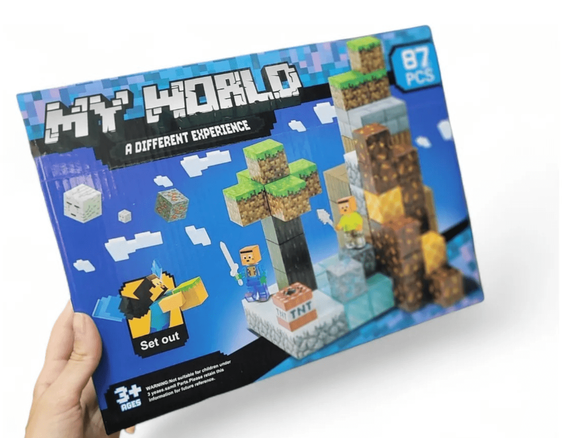 Juego de construcción tipo bloques ensamblables inspirado en entornos cúbicos digitales, compuesto por 87 piezas que permiten recrear estructuras, escenarios y figuras tipo pixeladas. El set incluye bloques temáticos (tierra, hielo, lava, minerales, etc.) y figuras tipo personaje, diseñados para ensamblaje manual sin necesidad de herramientas. Está orientado a actividades lúdicas y creativas, promoviendo la construcción modular tridimensional.