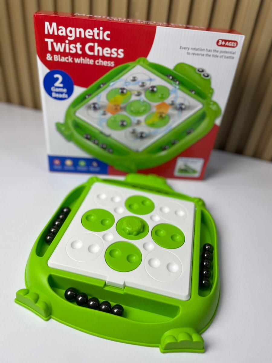 El Juego Magnético Dinosaurio – Magnetic Twist Chess es un tablero interactivo para niños mayores de 3 años, que combina elementos de estrategia con el uso de esferas magnéticas. El tablero tiene un diseño en forma de dinosaurio, lo que lo hace atractivo visualmente y más divertido para los pequeños. Su sistema de rotación permite cambiar la disposición de las piezas en cada turno, generando giros inesperados en el desarrollo del juego.