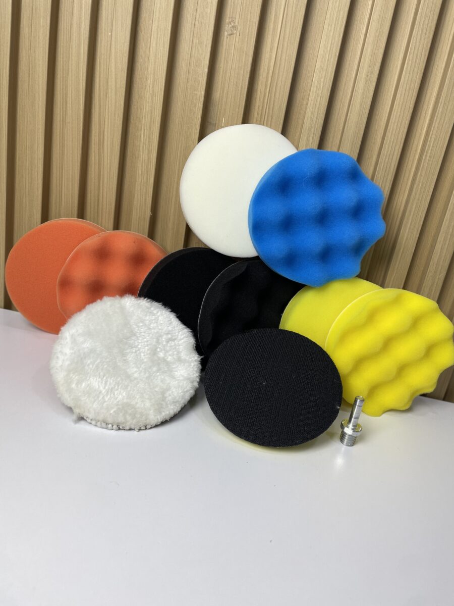 Kit de pulido compuesto por múltiples discos intercambiables diseñados para operaciones de corrección, abrillantado y acabado de superficies automotrices u otras superficies sólidas. El conjunto incluye almohadillas de diferentes materiales, densidades y geometrías superficiales, junto con un adaptador metálico para su acoplamiento a herramientas rotativas o pulidoras eléctricas. Cada disco está optimizado para una etapa específica del proceso de pulido, desde corte abrasivo hasta acabado fino.