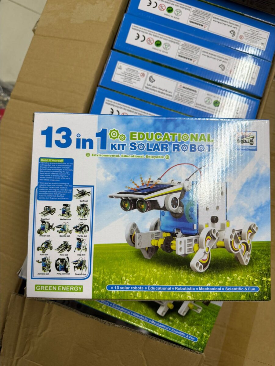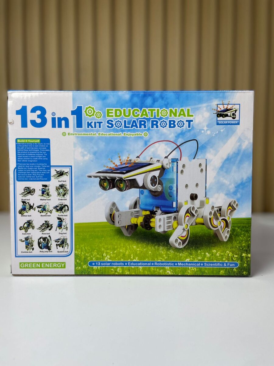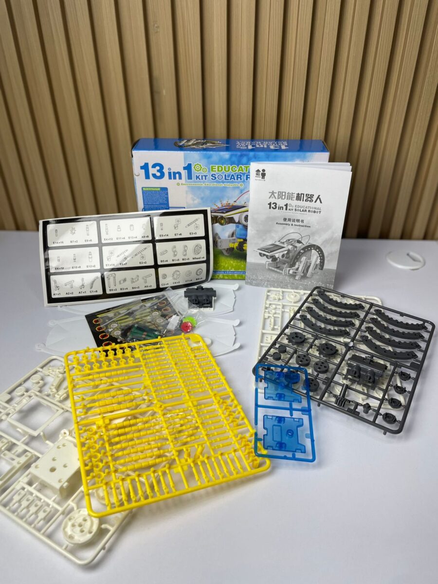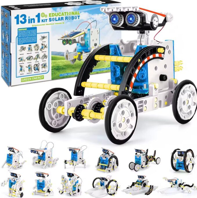 Kit educativo de robótica solar tipo “13 en 1” diseñado para el ensamblaje de múltiples configuraciones mecánicas funcionales a partir de un único conjunto de piezas. El sistema utiliza energía solar como fuente primaria de alimentación mediante un panel fotovoltaico integrado que suministra energía a un micromotor eléctrico. Permite la construcción de diferentes modelos móviles que operan sin baterías, orientado al aprendizaje de principios básicos de mecánica, electrónica y conversión de energía.