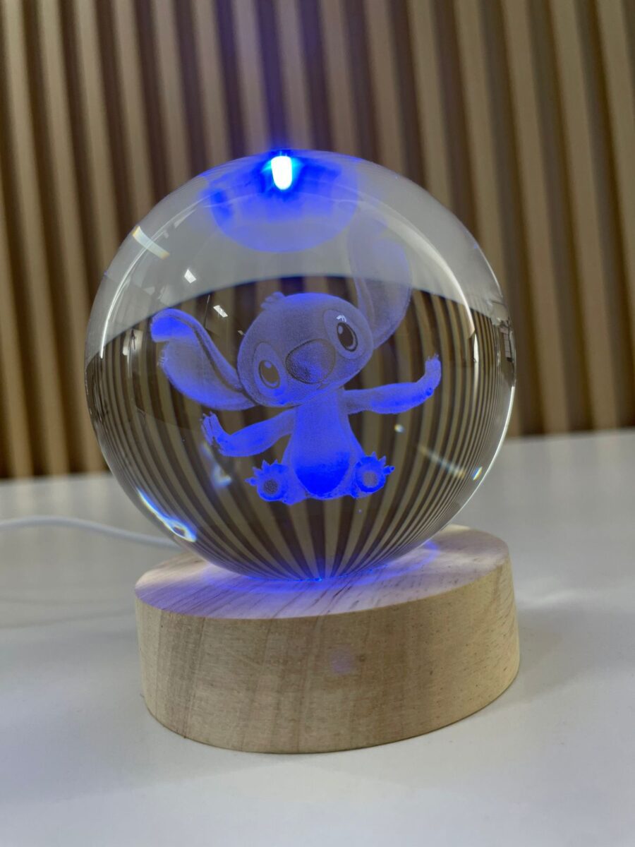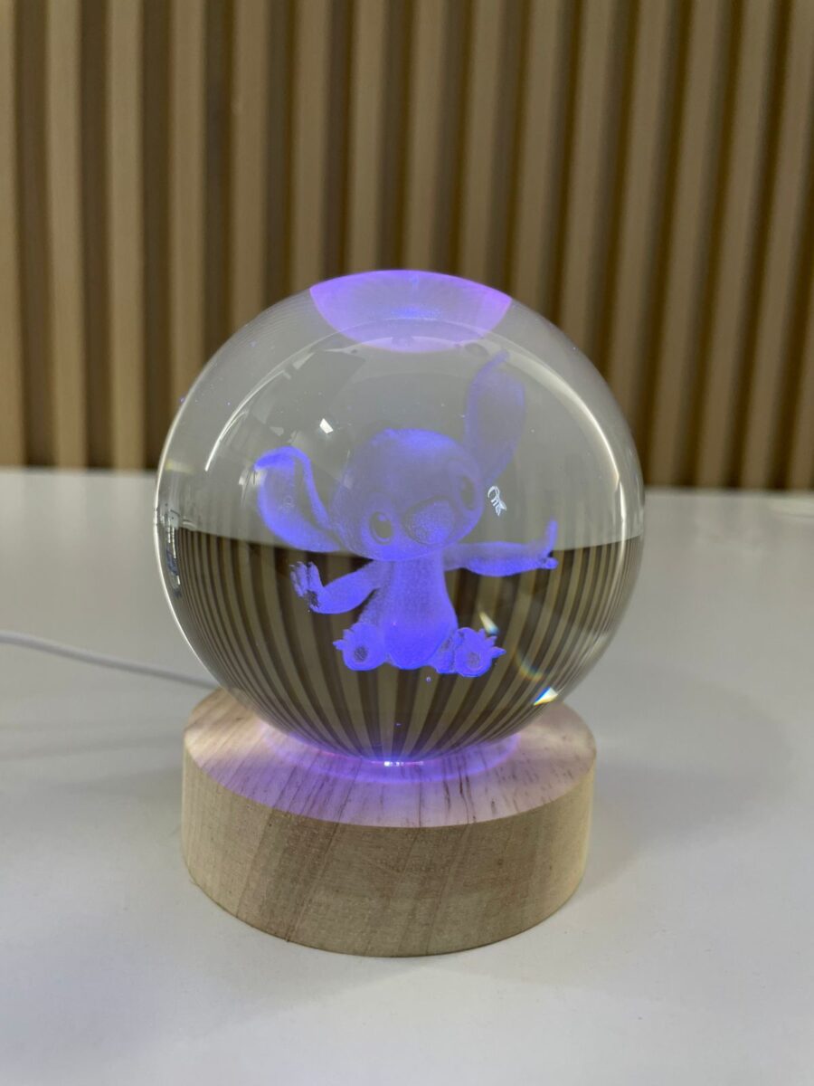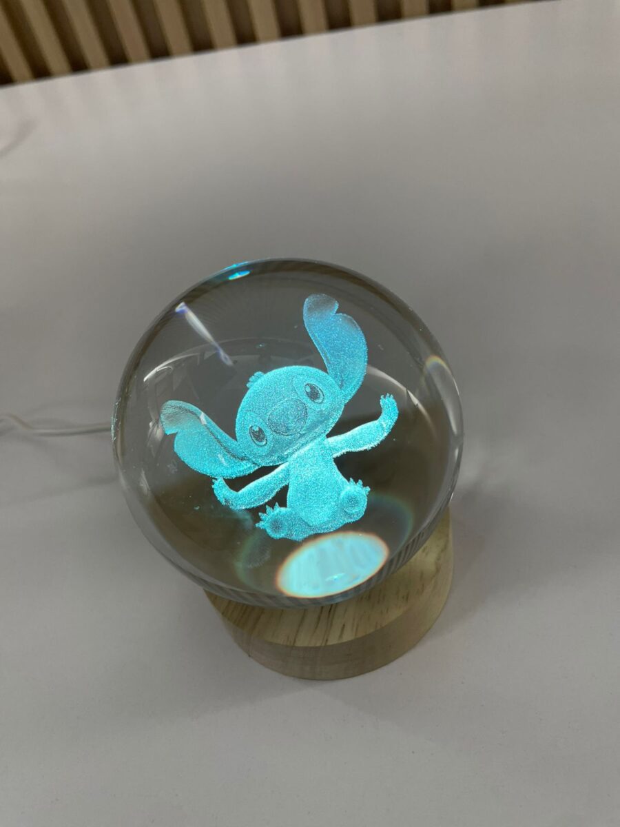 Una pieza decorativa elegante y única que combina tecnología LED de bajo consumo con un diseño tridimensional grabado en cristal. La figura de Stitch, tallada con precisión en el interior de la esfera, cobra vida con la iluminación, creando un ambiente cálido y acogedor en cualquier espacio