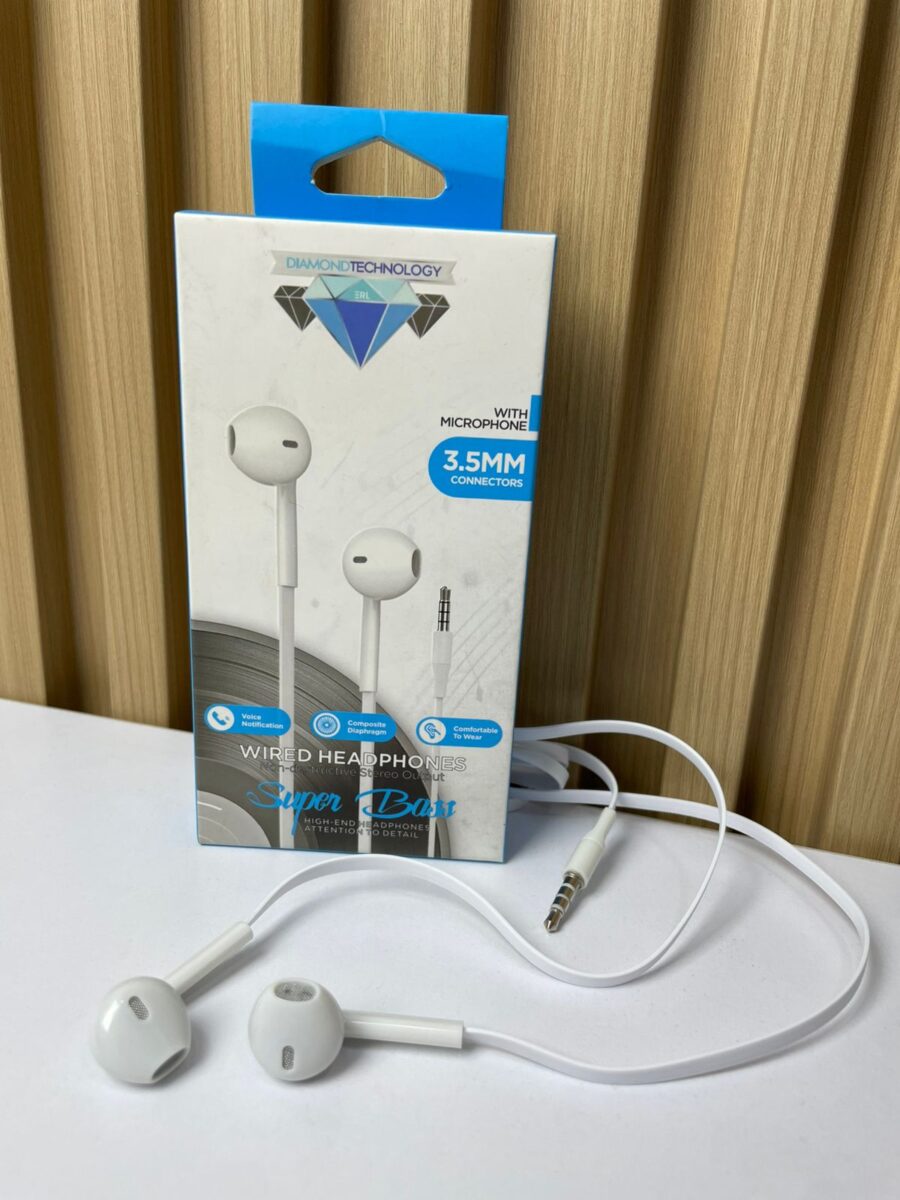 Los audífonos Diamond con conector 3.5 mm ofrecen una experiencia de sonido rica en graves profundos (Super Bass) y un diseño cómodo tipo earbud que se adapta perfectamente al oído. Con micrófono integrado y controles en línea, son ideales para música, llamadas y uso diario