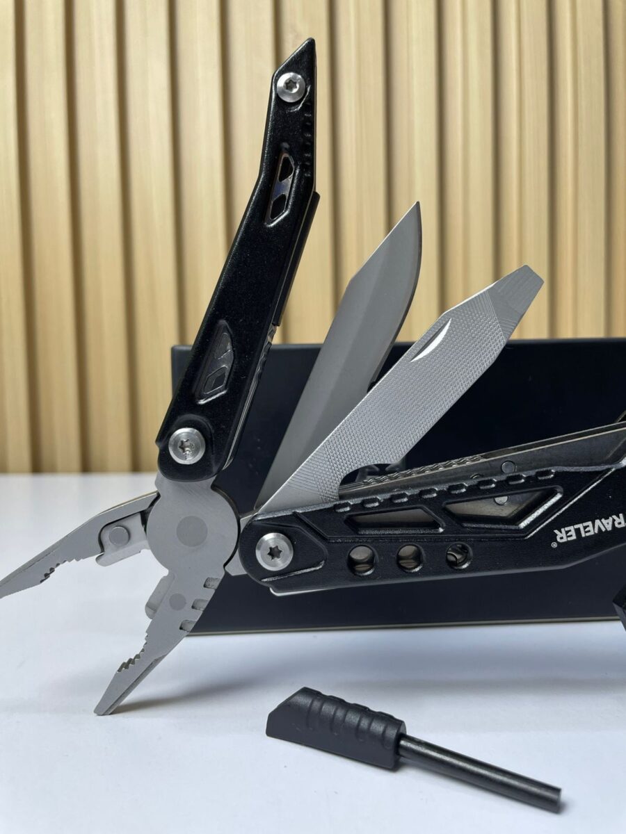La herramienta multifuncional Traveler es una navaja multiusos profesional diseñada para actividades de camping, rescate, supervivencia, mantenimiento y uso cotidiano. Su estructura combina acero inoxidable de alta resistencia con un cuerpo de aluminio anodizado, ofreciendo durabilidad, rigidez y resistencia a la corrosión. Incorpora múltiples funciones integradas en un diseño plegable compacto, ideal para situaciones de trabajo en campo o emergencia. Incluye funda de transporte táctica y piedra de ferrocerio para encendido de fuego.