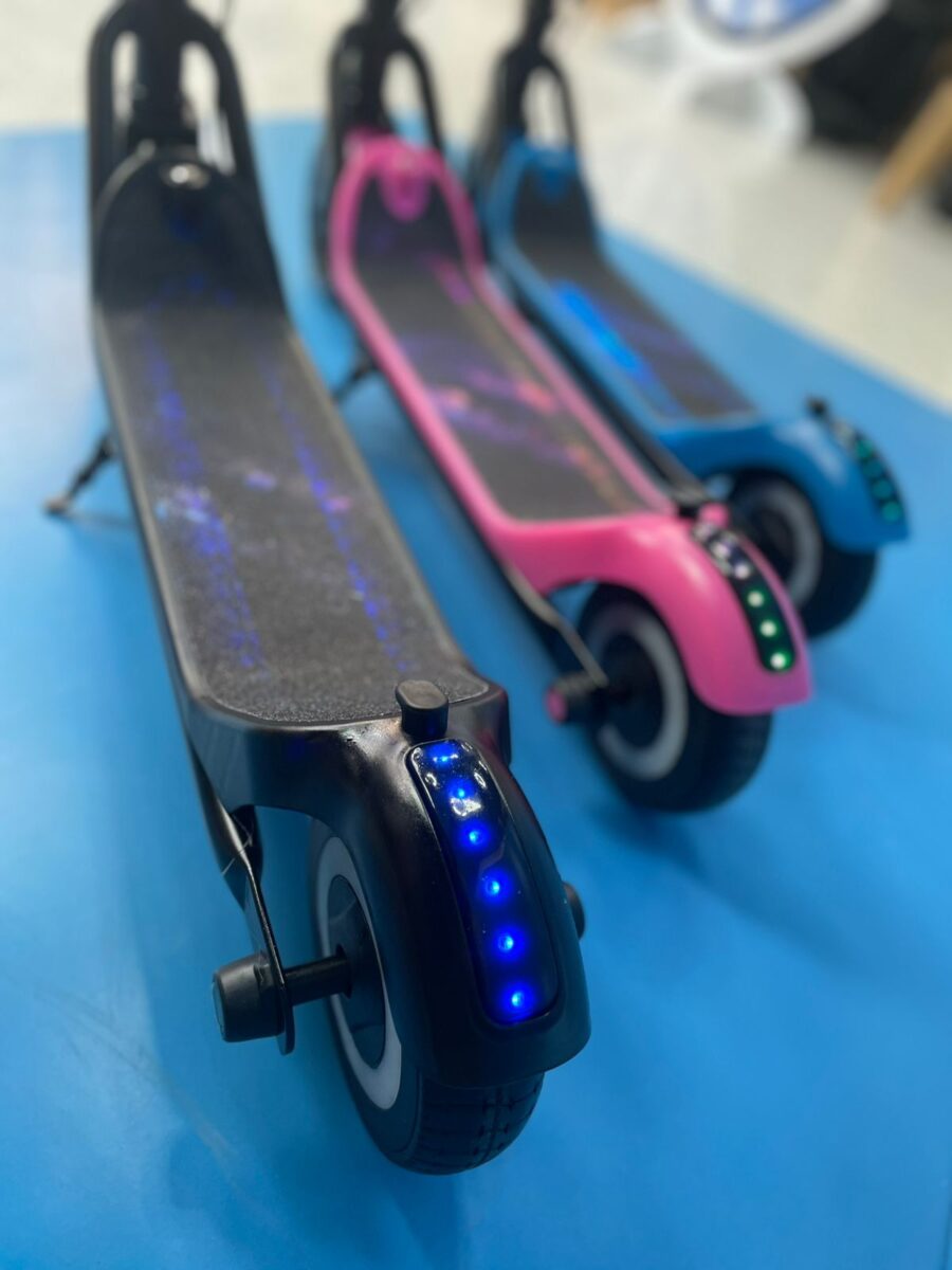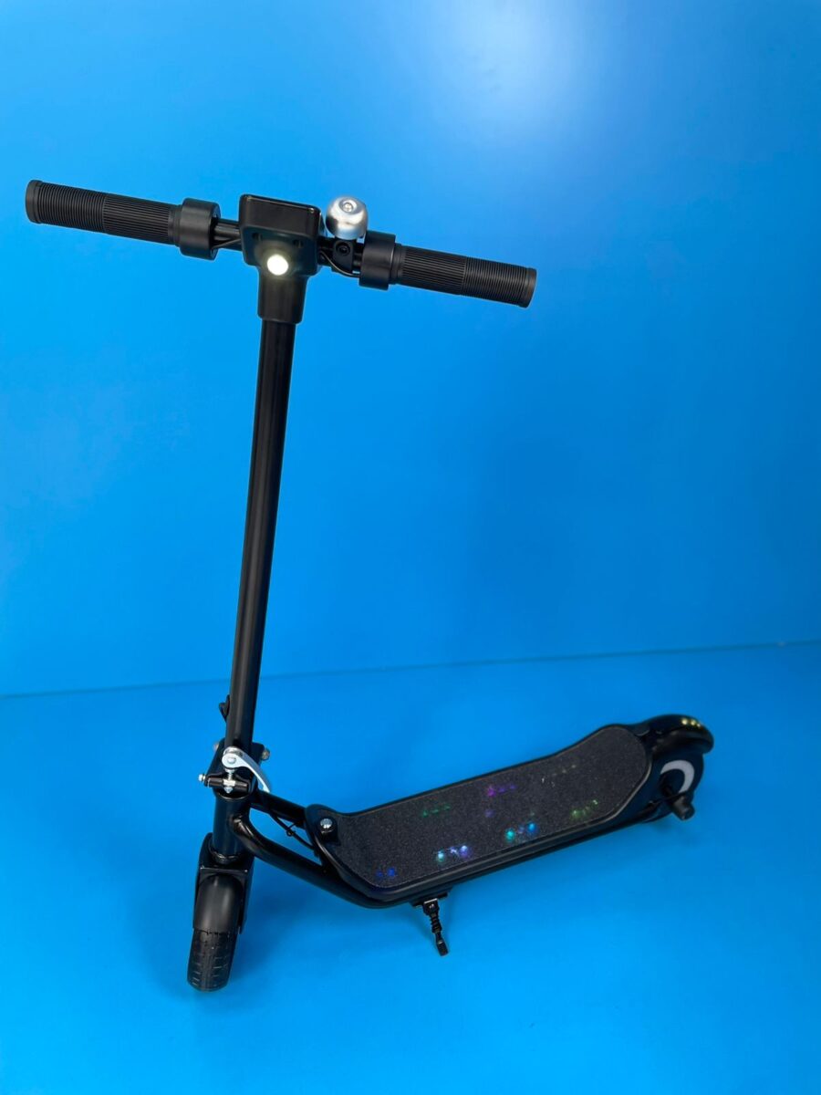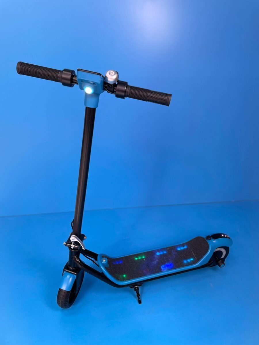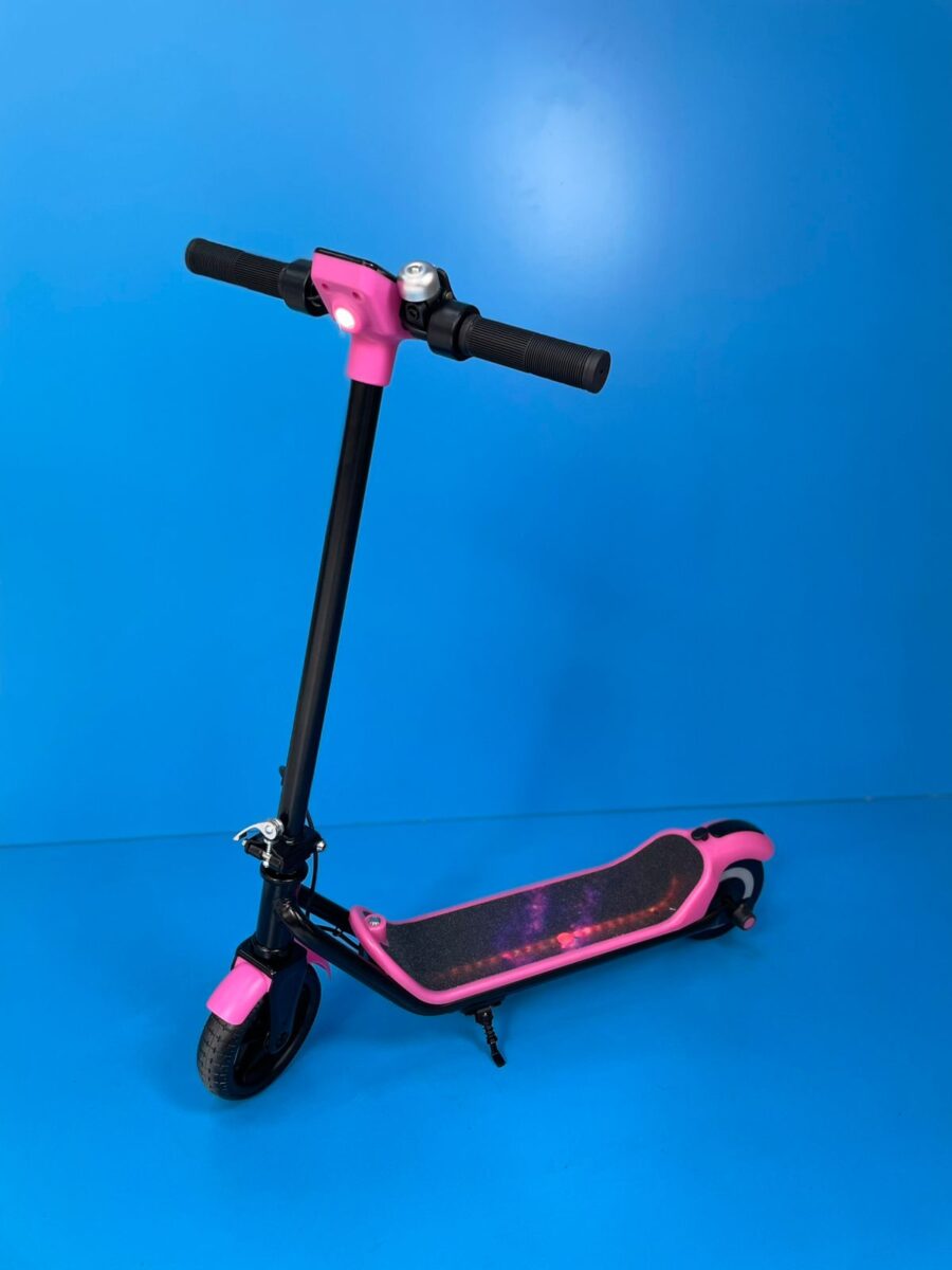 La patineta eléctrica para niños es un vehículo ligero diseñado para desplazamientos recreativos y controlados. Su estructura incorpora un motor eléctrico interno, un sistema electrónico de control de velocidad y un manillar ergonómico con iluminación LED frontal. El diseño está optimizado para estabilidad, bajo nivel de vibración y operación segura para usuarios infantiles, integrando una plataforma antideslizante y un sistema de frenado mecánico trasero.