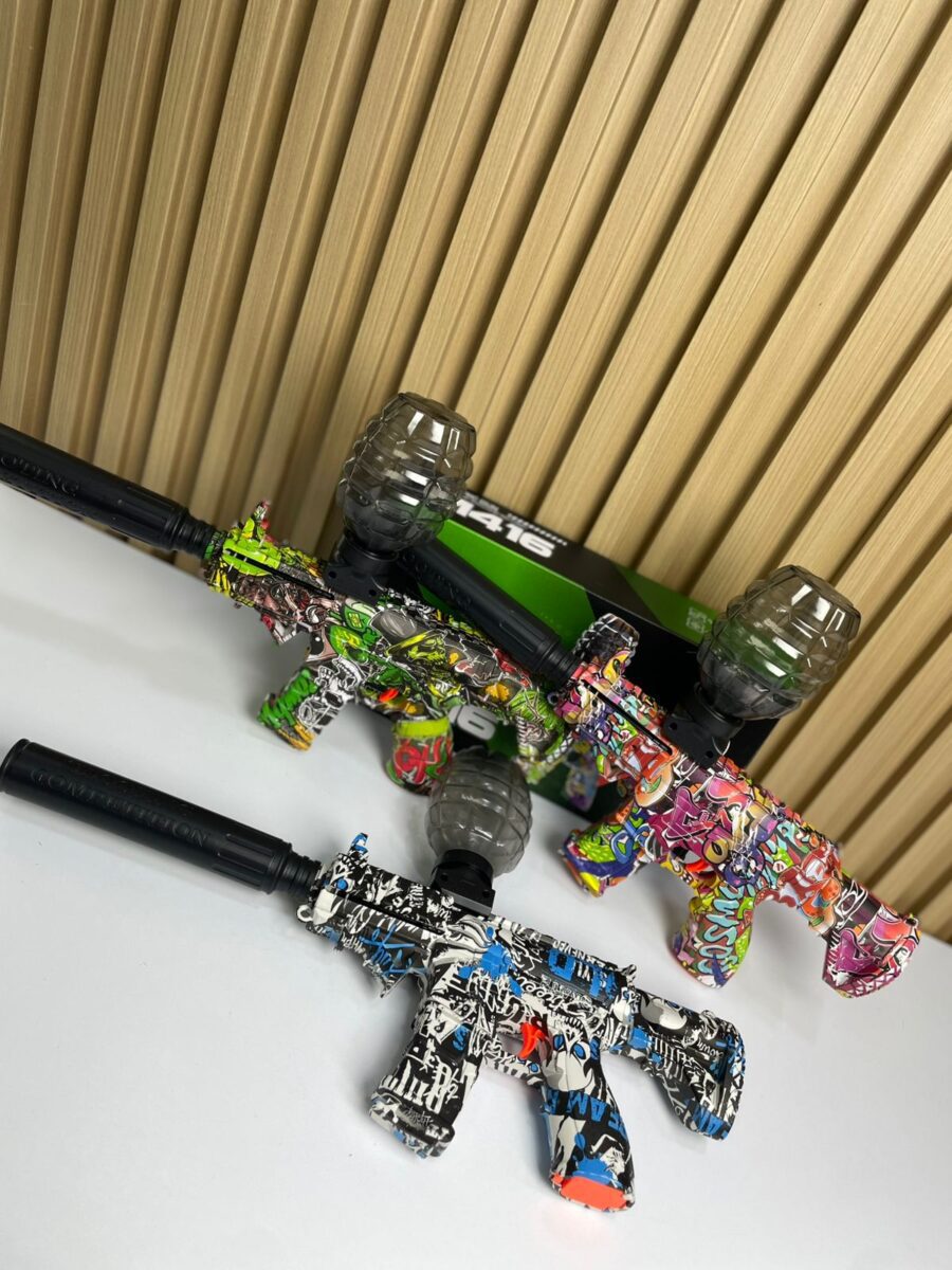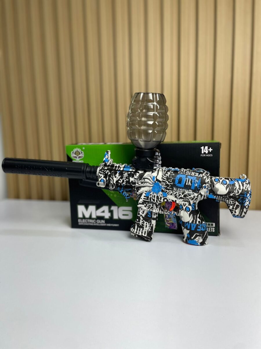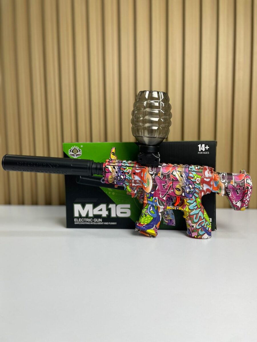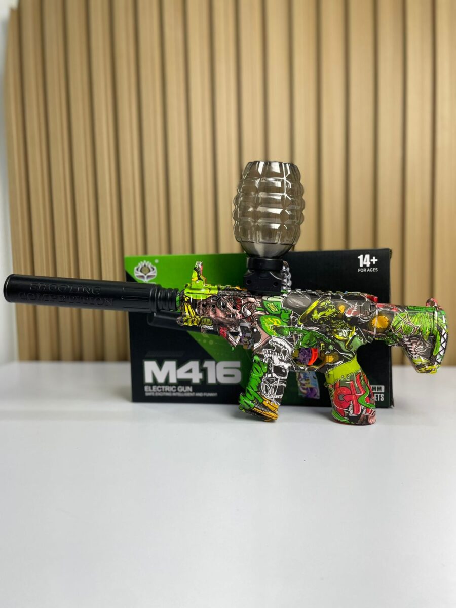 La Pistola M416 es un dispositivo recreativo de disparo automático diseñado para munición de gel de diámetro 7–8 mm. Su estructura está fabricada en polímeros ligeros y combina un mecanismo eléctrico interno con una tolva superior de alimentación por gravedad. El diseño del cuerpo replica la configuración general del modelo M416, con un patrón gráfico multicolor orientado a uso lúdico. Está destinada exclusivamente para usuarios mayores de 14 años y para actividades recreativas bajo condiciones controladas.