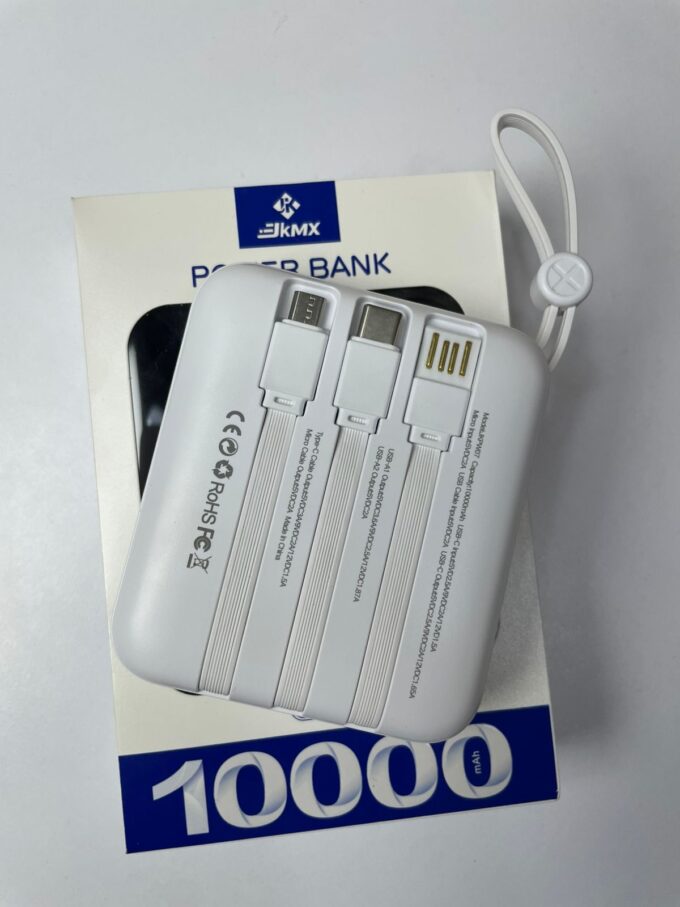 El JK-PW07 es un power bank versátil con 4 cables integrados (USB-C, Lightning, Micro USB y USB-A), perfecto para cargar múltiples dispositivos sin llevar cables por separado. Su diseño cuadrado y moderno lo hace ideal para llevar en el bolsillo o en el bolso, y viene con tecnología de carga rápida PD para una experiencia de uso más eficiente