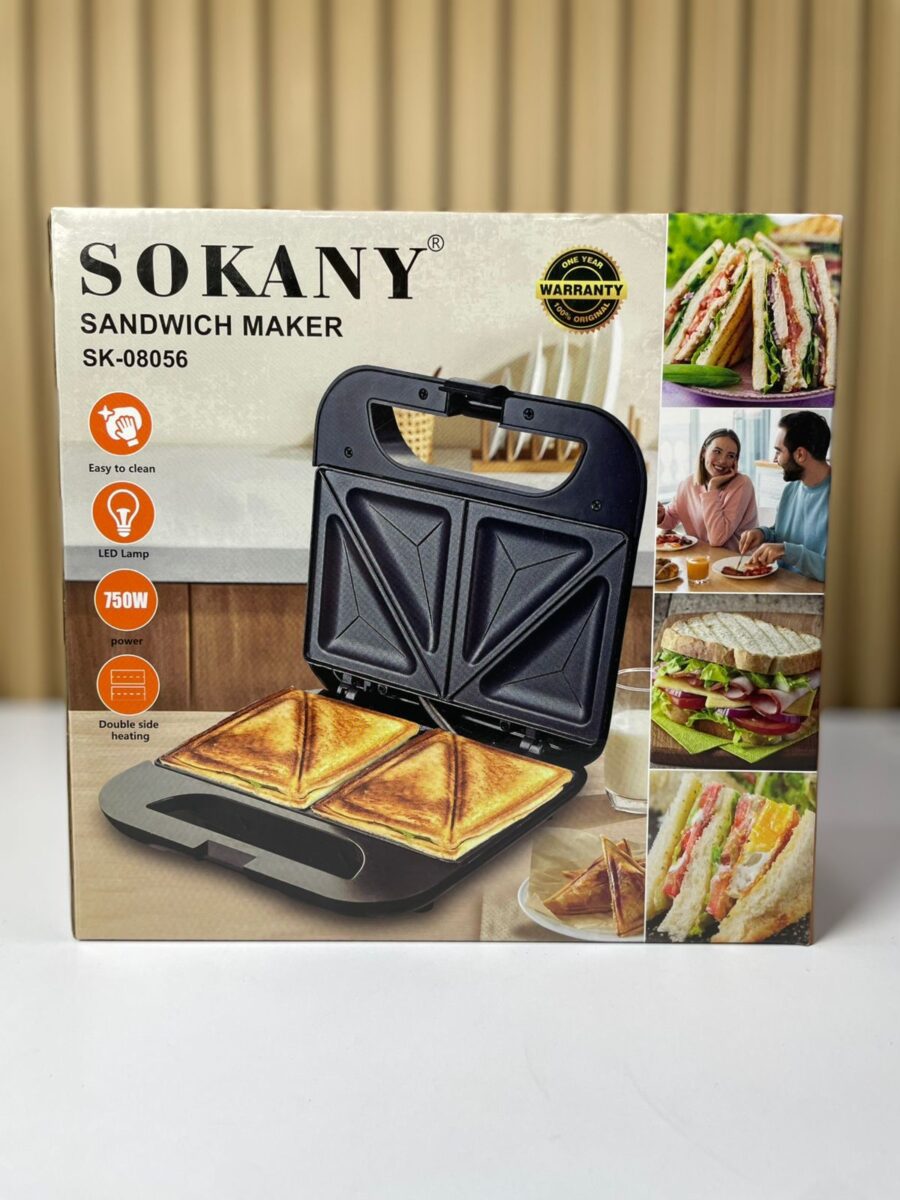 La sandwichera eléctrica Sokany SK-08056 es un electrodoméstico de uso doméstico diseñado para la preparación de sándwiches triangulares sellados mediante calentamiento eléctrico por contacto. Incorpora un sistema de calentamiento bilateral que permite una cocción uniforme del pan y del relleno. Está destinada a un uso cotidiano en entornos residenciales, con operación manual y control térmico automático interno.