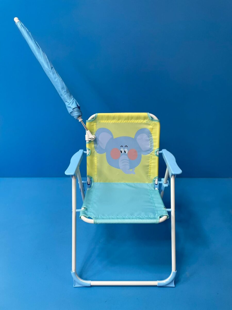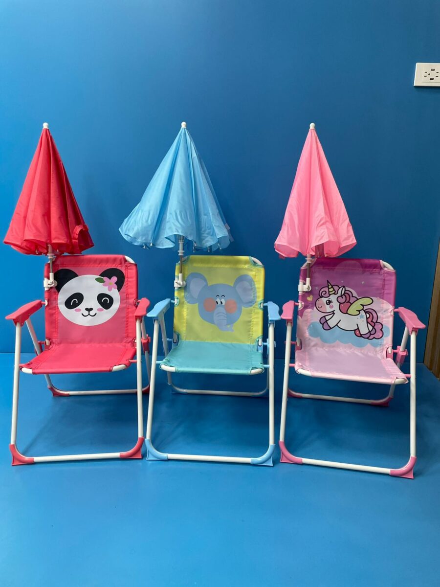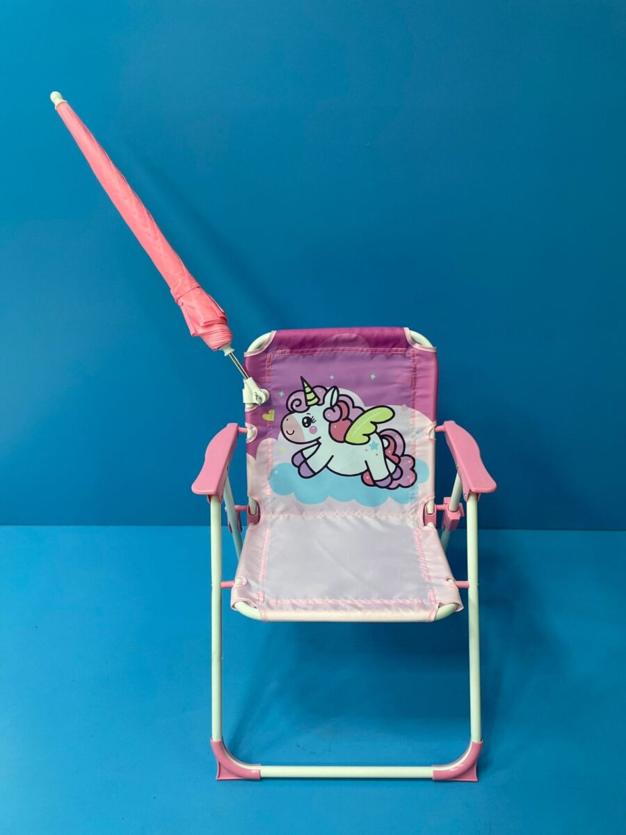 La silla infantil plegable mostrada es un asiento portátil diseñado para uso recreativo en interiores y exteriores. Su estructura metálica tubular proporciona soporte ligero, mientras que el asiento y respaldo están fabricados con tela sintética tensada. Incluye apoyabrazos rígidos y un sistema de plegado articulado que facilita su transporte y almacenamiento. El diseño presenta un estampado gráfico infantil en el respaldo.